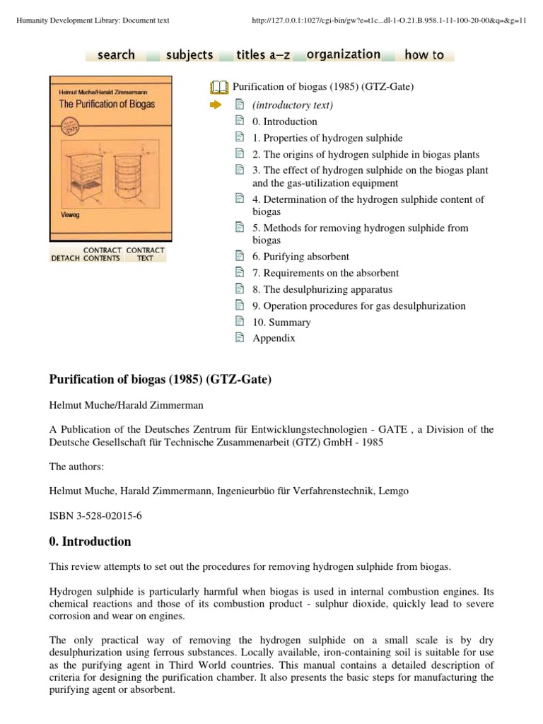 Purification of biogas (1985) (GTZ-Gate) (introductory text) 0. Introduction 1. Properties of hydrogen sulphide 2. The origins of hydrogen sulphide in biogas plants 3. The effect of hydrogen sulphide on the biogas plant and the gas-utilization equipment 4. Determination of the hydrogen sulphide content of biogas 5. Methods for removing hydrogen sulphide from biogas 6. Purifying absorbent 7. Requirements on the absorbent 8. The desulphurizing apparatus 9. Operation procedures for gas desulphurization 10. Summary Appendix