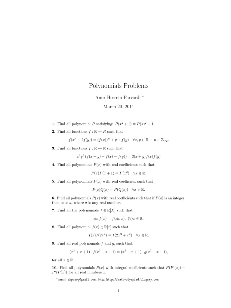 87. Let n and k be two positive integers. Determine all monic polynomials f Z[X ], of degree n, having the property that f (n) divides f 2k a , forall a Z, with f (a) = 0. 88. Find all polynomials P (x) such that P (x2 y 2 ) = P (x + y )P (x y ). 89. Let f (x) = x4 x3 + 8ax2 ax + a2 . Find all real number a such that f (x) = 0 has four dierent positive solutions. 90. Find all polynomial P R[x] such that: P (x2 + 2x + 1) = (P (x))2 + 1. 91. Let n 3 be a natural number. Find all nonconstant polynomials with real coecients f1 (x) , f2 (x) , . . . , fn (x), for which fk (x) fk+1 (x) = fk+1 (fk+2 (x)) , 1 k n,