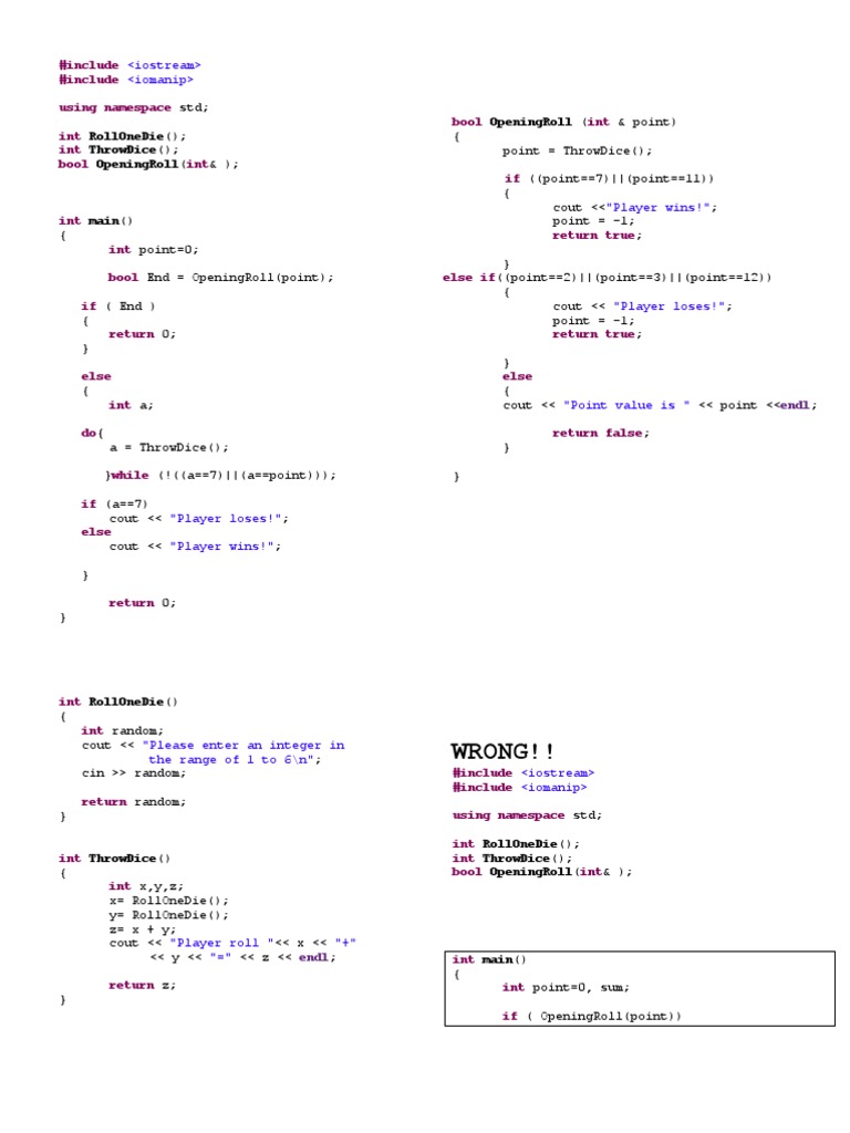 { return 0; } else { int a; do{ a = ThrowDice(); }while (!((a==7)||(a==sum))); if (a==7) cout << "Player loses!"; else cout << "Player wins!"; } return 0; } bool OpeningRoll (int & point) { int sum = ThrowDice(); if ((sum==7)||(sum==11)) { cout <<"Player wins!"; point = -1; return true; } else if ((sum==2)||(sum==3)||(sum==12)) { cout << "Player loses!"; point = -1; return true; } else { cout << "Point value is " << sum int RollOneDie() { int random; cout << "Please enter an integer in the range of 1 to 6\n"; cin >> random; return random; } <<endl; return false; } }