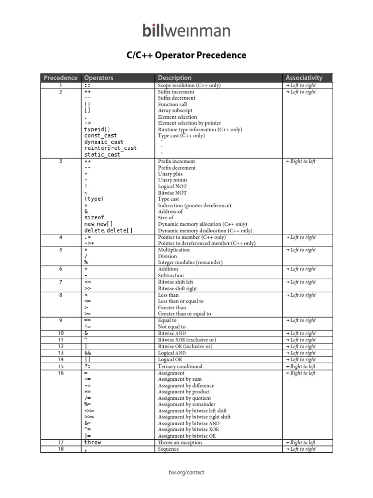 Scope resolution (C++ only) Suffix increment Suffix decrement Function call Array subscript Element selection Element selection by pointer Runtime type information (C++ only) Type cast (C++ only) " " " Prefix increment Prefix decrement Unary plus Unary minus Logical NOT Bitwise NOT Type cast Indirection (pointer dereference) Address-of Size-of Dynamic memory allocation (C++ only) Dynamic memory deallocation (C++ only) Pointer to member (C++ only) Pointer to dereferenced member (C++ only) Multiplication Division Integer modulus (remainder) Addition Subtraction Bitwise shift left Bitwise shift right Less than Less than or equal to Greater than Greater than or equal to Equal to Not equal to Bitwise AND Bitwise XOR (exclusive or) Bitwise OR (inclusive or) Logical AND Logical OR Ternary conditional Assignment Assignment by sum Assignment by difference Assignment by product Assignment by quotient Assignment by remainder Assignment by bitwise left shift Assignment by bitwise right shift Assignment by bitwise AND Assignment by bitwise XOR Assignment by bitwise OR Throw an exception Sequence
