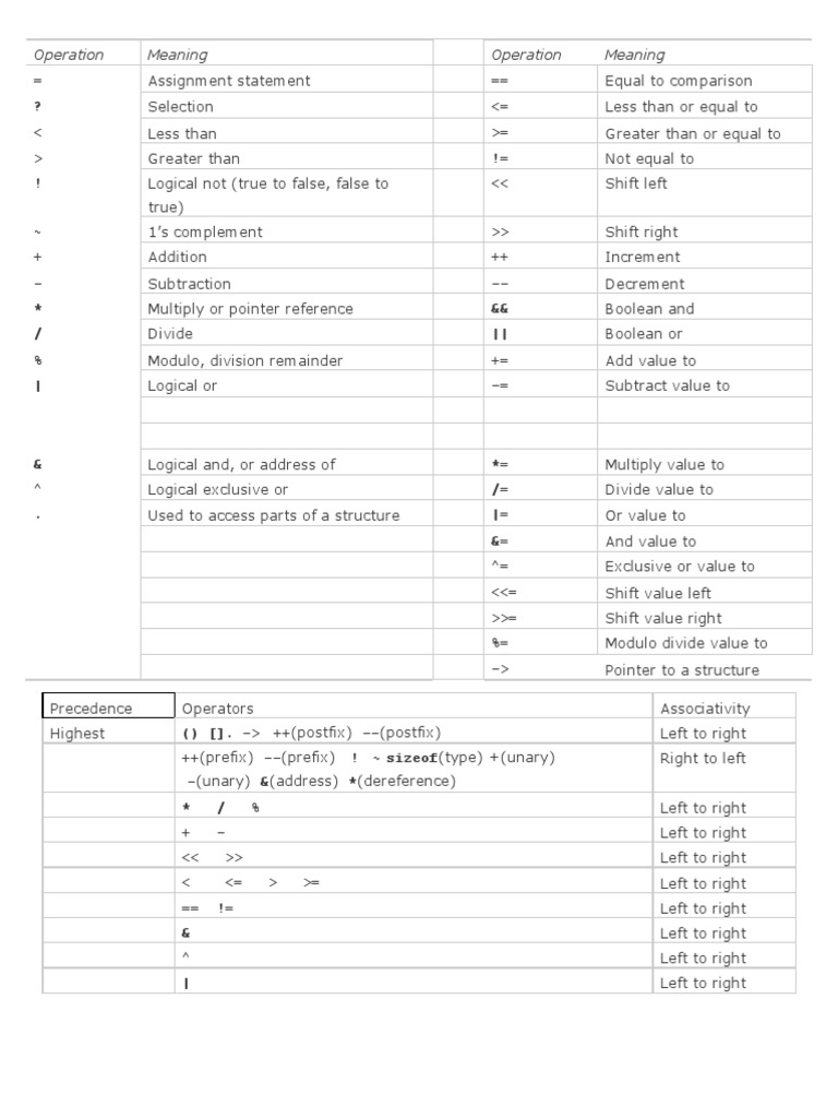 Meaning Assignment statement Selection Less than Greater than Logical not (true to false, false to true) 1s complement Addition Subtraction Multiply or pointer reference Divide Modulo, division remainder Logical or