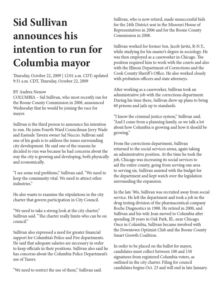 Thursday, October 22, 2009 | 12:01 a.m. CDT; updated 9:31 a.m. CDT, Thursday, October 22, 2009 BY Andrea Nenow COLUMBIA Sid Sullivan, who most recently ran for the Boone County Commission in 2008, announced Wednesday that he would be joining the race for mayor. Sullivan is the third person to announce his intention to run. He joins Fourth Ward Councilman Jerry Wade and Eastside Tavern owner Sal Nuccio. Sullivan said one of his goals is to address the issues surrounding city development. He said one of the reasons he decided to run was because he had concerns about the way the city is growing and developing, both physically and economically. I see some real problems, Sullivan said. We need to keep the community vital. We need to attract other industries. He also wants to examine the stipulations in the city charter that govern participation in City Council. We need to take a strong look at the city charter, Sullivan said. The charter really limits who can be on council. Sullivan also expressed a need for greater financial support for Columbias Police and Fire departments. He said that adequate salaries are necessary in order to keep officials in their positions. Sullivan also said he has concerns about the Columbia Police Departments use of Tasers. We need to restrict the use of them, Sullivan said.