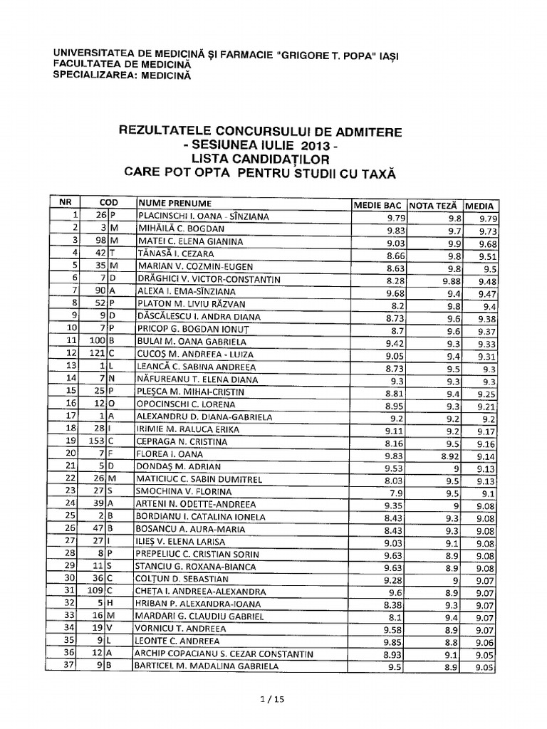 UNIVERSITATEA DE MEDICINA $1 FARMACIE "GRIGORE T. POPA' IASI FACULTATEA DE MEDICINA SPECIALIZAREA: MEDICINA REZULTATELE CONCURSULUI DE ADMITERE - SESIUNEA JULIE 2013 - LISTA CANDIDATILOR CARE POT OPTA PENTRU STUDII CU TAXA NR [COD _[NUME PRENUME. [IMEDIE BAC [NOTA TEZA [MEDIA i] 26[P |PLACINSCHI. OANA SINZIANA 379 9.8| 9.79] 2] 3|M_| MIHAILA C. BOGDAN 9.83 97] 9.73] 3] 98[M | MATEIC, ELENA GIANINA 9.03 39] 9.68] 4) 42\T [TANASA |. CEZARA 8.66) 9.8} 9.51] S| 35|M__ [MARIAN V. COZMIN-EUGEN 8.63] 98] 95] 6|_7/0__|ORAGHICI V. VICTOR-CONSTANTIN: 8.28] 9.83] 9.48 7| 90/4 [ALEXA]. EMa-SINZIANA 9-68] 9.4[ 9.47] 8] 52[P__|PLATON M. Liviu RAZVAN. 82 33] 9.4) ‘9[9[D [DASCALESCU 1. ANDRA DIANA 873 9.6] 9.38) 10|"_7|P___[PRICOP G. BOGDAN IONUT a7] 36] 9.37 11{”100|8 |BULATM. OANA GABRIELA, 9.42] 93] 9.33 12] 123/¢__|CUCOS M. ANDREA - LUIZA 9.05) 9.4] 9.31 13] ae LEANCA C. SABINA ANDREEA 8.73] 9.5] 9.3| 14) 7|N___|NAFUREANU T. ELENA DIANA 9.3| 9.3] 9.3] as|25/P|PLESCA M. MIHAI-CRISTIN 8.81 9.4] 9.25 16] 12/0 [OPOCINSCHIC. LORENA 8.95 9.3] 9.21 a7] aja [ALEXANDRU D. DIANA-GABRIELA 92 92] 9.2 18] 28|1__|IRIMIE M. RALUCA ERIKA 9.11 92] 9.17 19] 153[C __|CEPRAGA N. CRISTINA 8.16| 95| 9.16 20] 7|F —_|FLOREA |. OANA, 9.83 892| 9.14] zal 5|>__[DONDAS M_ ADRIAN 9.53 ‘| 9.13] 22] 26[M__[MATICIUCC. SABIN DUMITREL 8.03 95] 9.13 23[_27|S__|SMOCHINA V. FLORINA 73 95] 94 24|39/A___|ARTENIN. ODETTE-ANDREEA 9.35; 9] 9.08| 25| 2|8 _|BORDIANUL, CATALINA IONELA 8.43; 9.3) 9.08] 26] 47/8 |BOSANCU A. AURA-MARIA 8.43] 9:3] 9.08] 27] 27]__|IWIES V. ELENA LARISA 9.03; 3i[ 9.08 28] 8|P__ |PREPELIUC C. CRISTIAN SORIN 9.63 aa| 9.08 29| 22|S_|STANCIUG. ROXANA-BIANCA, 9.63 89] 9.08 30{__36[¢ _[COLTUN 0. SEBASTIAN 9.28 9] 9.07] 31] 109/C _[CHETA |. ANDREEA-ALEXANDRA 9.6 3.9] _ 9.07| 32] S[H__|HRIBAN P. ALEXANDRA-IOANA, 8.38 93] 9.07 33] 16|M__|MARDARIG. CLAUDIU GABRIEL 84 9.4) 9.07 34|19[v___{VORNICUT. ANDREEA 9.58] 89| 9.07 35| [Lk __|LEONTE C. ANDREA 9.85 8.8] 9.06 36| 12/A_[ARCHIP COPACIANU S. CEZAR CONSTANTIN 3.93 9.1] 9.05] 37] 9|8 |BARTICEL M. MADALINA GABRIELA. 95) 3.3] 9.05] 1/15 NR [COD [NUME PRENUME [MEDIE BAC [NOTA TEZA [MEDIA 38| _36]6 __ |GURGU F. ANA-MARIA 35 as] 9.05} 39[ 2a] [LUCHIANT. LANA, 3.01] 9.4] 9.05} 40|__27|P [POPESCU P. Mania 9.23| 9[_ 9.05 4i[95|¢ _|CONDRIUCG. IUSTINA PETRA 3.36| sal 9.04 42 32[6”|GUGOASA V. ANDREA. 8.56 9.2[ 9.04) 43|19|M__|wru 1, 1ULIANA 9.43] 8.92[ 9.04 44|__ 40 JonoFRéiT. LUCIAN 8.53] 32) 9.04] 45| 55/5 |STAN |. RAMONA-CATALINA 9.16 3|_ 9.04] 46|_4a|c__|CIOBOTARU V. DANA- GEORGIANA 9.43| 5] 9.03} 47|3)) ule D. AUINA-DUMITRITA 378 9.1] 9.02! 48] 5|5__ |ScORTANU |. ADINA 94 9[_ 9.02 49|5|z__|ZAHARIAC. MARIA MADALINA 34 as] _9.02 50| 12|C __|CHIOSA E. ANA-RALUCA 3.77] 9al_9.01 Sa] 15[H|HEMEN A. PATRICIA MADALINA 9.28 8.92| 9.01) 52 24[H__|EREA M. OANA-MaARiA 3.76 9af 9.01 53) _27[H__|HITRUC G. MADALINA VASILICA, 9.35) 8.9] 9.01) 54[ 78/0 [PREDAG. CARLA-MARIA 8.23] 9.28| 9.03 $5| 3|v__|VULPE E. LOREDANA-LAVINIA, 9.06| 9[_ 9.0 56] 6JA__[AGAVRILOAE! D. BOGDAN DUMITRU 9.33 a) 37|40|c__|CRETU S. MANUELA 9.6] a) 58|__39[0 [DOLTU A. DENISA-LAURA 36 aa | 59] 60s [STOLERIU V. siLviU PAUL 8.04] | 9 60[_20/T__[TANASA C, PAULA RAMONA 3 af 9 61] 17]U__|URZICA P. PAUL SEBASTIAN a3 93,9 62| _64]A__[AVASILCAI 5. STEFANA, 9.56| 8.8] 8.99) 63|__6a/S__|STOIANC. ELENA 9.56| 3.8[ 899 64] 10[0_IDORCU. PAULA-IULIANA 3.93 3| 8.98 65[_1a[1 _[IONITA M. ANA 3.65 9.1] 8.98] 66|__68[B__[BUCURC. LAURA ELENA 9.3] 3.2[ 8.97 67|_25|D [DURA D. LUANA-SIMINA 3.48] 38] 897 68{_20}H1 ___|HORVAT | IRINA-ANDREEA 95 88] 8.97 69|_66[P__|PANFIL F. ANCUTA-GABRIELA 9.18| 39| 8.97 70] _17[A__ |ASAFTEIC. ANDRADA 9.75 87] 8.96 7a] 22|6_|GRADINARU C. MONICA-ROXANA 7.66| aa] 8.96) Ta] 49[6 _[GRAMADA |. MIHAELA ADELINA 7.65 sal 8.95} 73|_a8[1_—|IACOBESCU |. RADU-ALEXANDRU 3.76 a7] 8.95] 74|__75|M_|MAFTEI 0. THEODOR-ALIN 9.45| 38] 8.96] 75[__13]U__|UNGURENASU P. ANDREEA-SIMONA, 9.48] 8.8] 8.96] 76|_145|C__|CURELARIU R. FLAVIA PETRINA 9.14] 3.9] 8.95] 77| 7 |LEOSTEAN F. MAGDALENA ALEXANDRA, 3.33] 816] 8.95] 78|__25|A___ |APROTOSOAEI C. ELENA-ROXANA. 8.73 3.94 79 _~59[¢__|CRETU C. ALEXANDRA-DIANA 9.38] Bal 8.94] 80] 28|G__|[GHETIU G. SAMUEL 9.08] as] 8.94] $2| 160 |OBREJAM. ANDREA - LAURA 8.73] 3[_8.94 82[9|P__|PAVALV. BOGDAN-GABRIEL 9.68] 37] 89a] 83|__7[H__|HALANDUT P. PAULA 9.65| a7 893 84] 20/1 _JIAMANDID. MIA 8.75| of 2.93 85| _20|V__|VAIDEANU C. ALEXANDRU 3.45 sal 8.93} 86| _30|C__|CHELBAN C. ISABELLA DIANA 9.6 a7 8.92; 2/18 NR | COD [NUME PRENUME MEDIE BAC [NOTA TEZA [MEDIA 87|62[P__|PETCUD. ELIZA MARIA 9.61 37] 8.92 88|__61|C__|COLESSA D. ANDREA 9.25 as| 8.911 89[_110|C___|CERBU D. DANA ALEXANDRA 7.46| eal 8.91] 90[_136]C —_[CHIRILA C. MADALINA 9.25] sal 8.91] 91] 70[8 _[BOGHEAN v. Daiana 95 878.5] 92|"135|C__|CLIPA P. MARIA-DAIANA 3.93 as] 39] 93|5|T___[TARANU G. GEORGIANA. 9.83] a5| 89) 94| 2] |NASTASA V. ROBERT-RADU. 9.48 a7 8.9} 95| 6|D_|DIACONU 0. ANDREA ROXANA 9.15| 8.3] 8.88] 96| 58|6__|GAVRILITA V. ANASTASIA 9.75| 8.6] 8.8! 97 70[P _[PITICAR G. STEFAN - CAUN 383 8.9[ 8.88 98| 50|6_|GORCIACL. vicroRIA 10 85| 887 99[16|HW__|HUTU V. IRINA-CAMELIA Ext 8.8] 8.87 100 a7]! iISEIT. LAURA-LILIANA 94 37| 8.87 201] 9[M_ [IRCA M. ANA-MaRiA. 9.38] 37] 8.87 302] 2/0 [OPRISAN 1, ANCA 7.51] 9.2] 887 103] 4k [ROATA|. 1ULIA-OANA 94 37| 887 104] 99[C__[CRIHAN G. ANTONIO 3.05; 3.8| 8.86 105] 11/6 [GAVRIL P_ ELENA-MADALINA 9.43] 8.68] 8.86 106] _28[S__|SANDULACHE A. STEFAN 9.36 8.7] 8.86| 707] s1|5__|SEGHEDIN.L. AURAIOANA 9.36| 37] 8.86 108[~20|¢ | CARDONEANU E. ANCUTA-MIHAELA 96 3.6[ 8.85 103] 4] [HINCU C. ELENA-SANDRA 9.63| 8.6[ 8.85 tof 20) [NITUC I DANIELA, 93 87| 8.85 aii] a4[0 [0106 D. MIHAELA-ALEXANDRA 93 a7] 8.35] 112] "72/8 [BOBU D. DANIELA-PETRONELA 9.26 a7] 8.84 213] 15[R__ [RATAN ROXANA 9.28| 87] 8.84 114] 4i|s___[SEMIAN |. ALINA-ELENA 3.99] 83] 8.84 115] 83[¢__ [CRISTEA C. ANDRA-FLORENTINA 8.63] as] 5.83 116] G[E_|ENACHE S. BIANCA-ANDREEA 8.95] 33] 8.83 117|5|F | FLORESCU V. CRISTIAN-MARIUS 9.23] a7 8.33} 11g] 