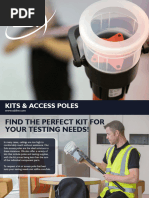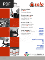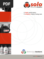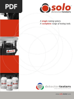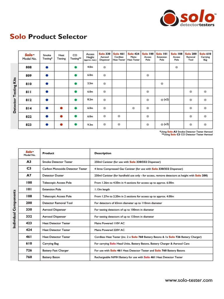 This document provides a product selector and descriptions for Solo detector testing kits. It lists various models of smoke, heat, and CO detector testers with information on their maximum access heights and included accessories. Additional details are given on individual components like aerosol dispensers, heat detectors, access poles, carrying bags, and batteries that can be used with the testing kits.