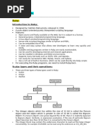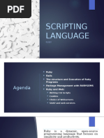 Ruby is a dynamically typed language where variables start with $, strings can be interpolated with #{variable}, and everything is an object. Modules define reusable code and can be mixed into classes, providing a namespace. Variables hold references to objects and assigning with = copies the reference, so objects need to be cloned to prevent changes from affecting other references. Constants are convention rather than enforced, and modifying an existing constant issues a warning. Control structures include if/unless/elsif, case/when/then, and loops like while, for, and until.
