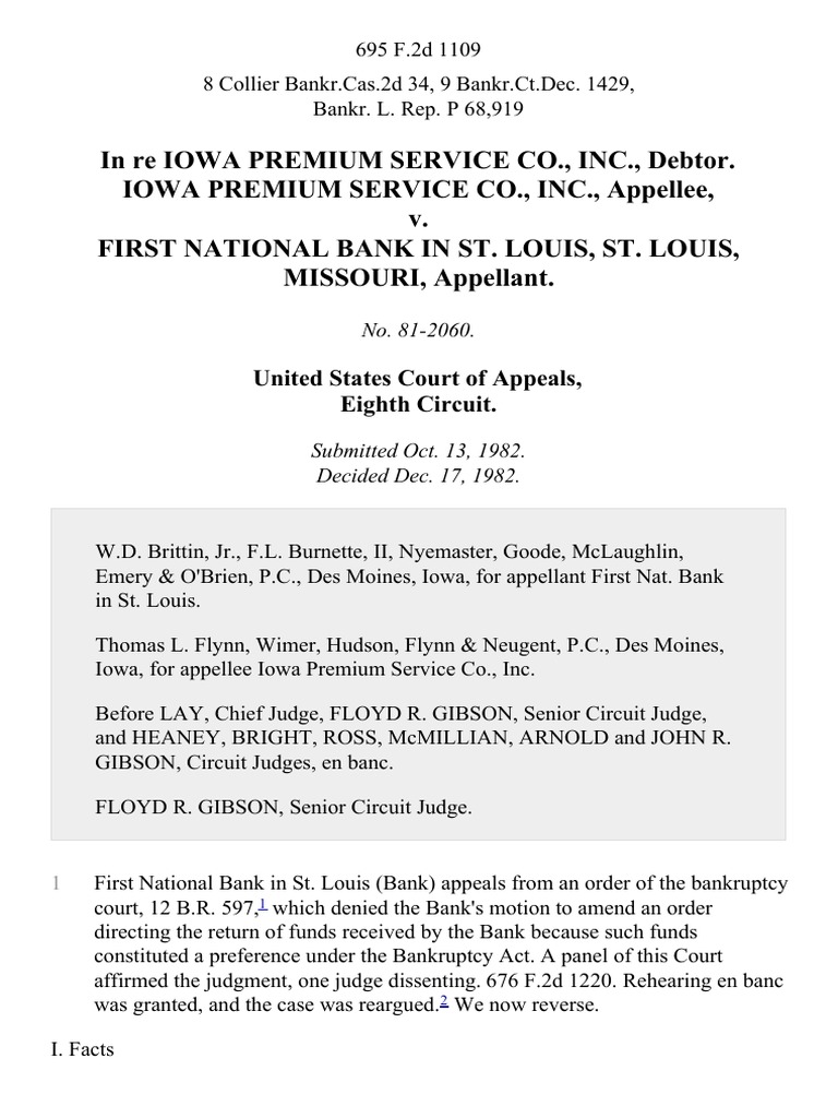 In Re Iowa Premium Service Co., Inc., Debtor. Iowa Premium Service Co., Inc. v. First National Bank in St. Louis, St. Louis, Missouri, 695 F.2d 1109, 1st Cir. (1982)