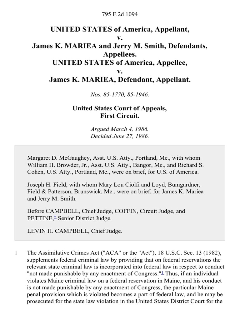violates Maine criminal law on a federal reservation in Maine, and his conduct