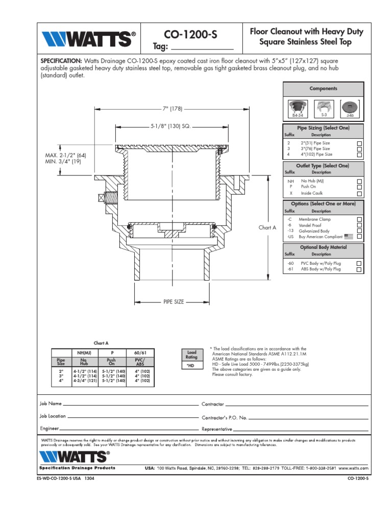 SPECIFICATION: Watts Drainage CO-1200-S epoxy coated cast iron oor cleanout with 5x5 (127x127) square adjustable gasketed heavy duty stainless steel top, removable gas tight gasketed brass cleanout plug, and no hub (standard) outlet.