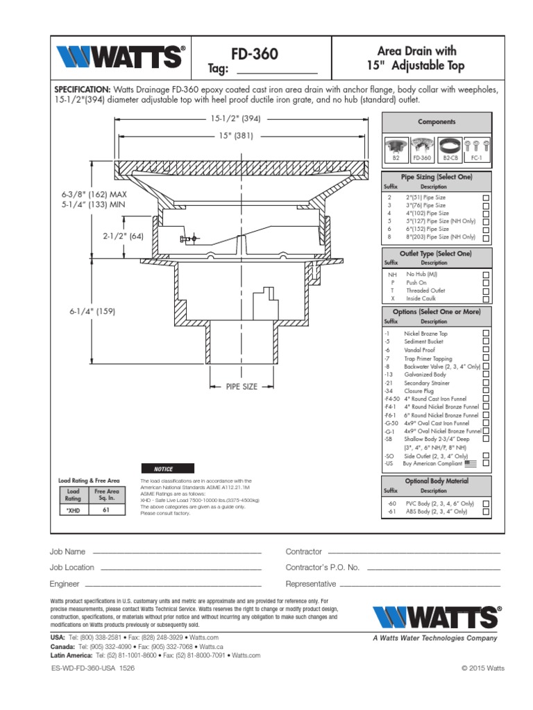 SPECIFICATION: Watts Drainage FD-360 epoxy coated cast iron area drain with anchor flange, body collar with weepholes,