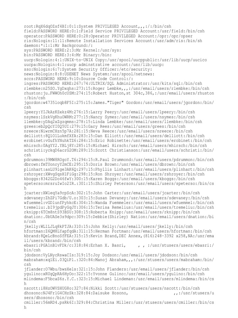 dbrown:fmTUonryY2mCE:295:15:Doris Brown:/usr/email/users/dbrown:/bin/csh