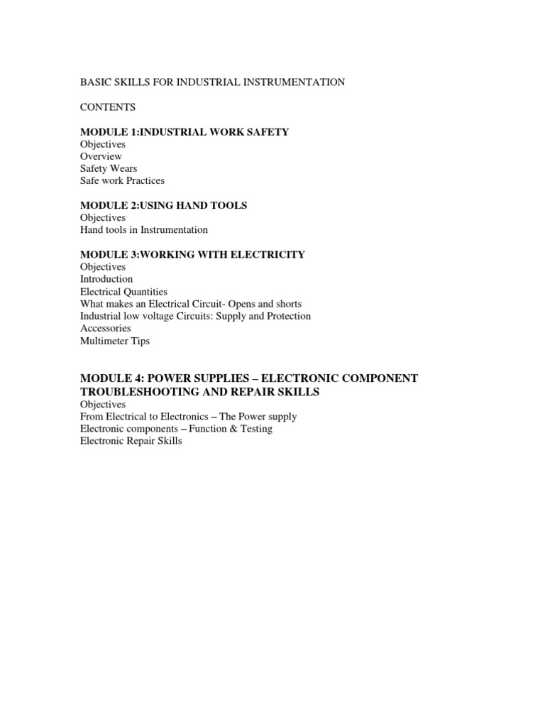 work Practices MODULE 2:USING HAND TOOLS Objectives Hand tools in Instrumentation MODULE 3:WORKING WITH ELECTRICITY Objectives Introduction Electrical Quantities What makes an Electrical Circuit- Opens and shorts Industrial low voltage Circuits: Supply and Protection Accessories Multimeter Tips