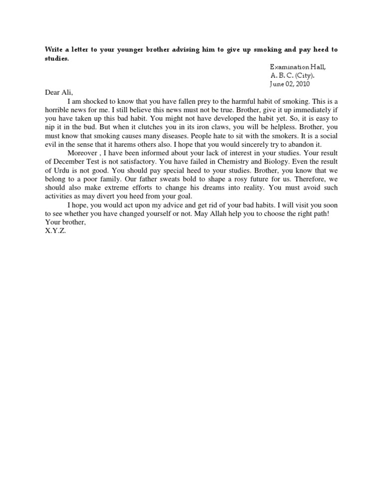 Dear Ali, I am shocked to know that you have fallen prey to the harmful habit of smoking. This is a horrible news for me. I still believe this news must not be true. Brother, give it up immediately if you have taken up this bad habit. You might not have developed the habit yet. So, it is easy to nip it in the bud. But when it clutches you in its iron claws, you will be helpless. Brother, you must know that smoking causes many diseases. People hate to sit with the smokers. It is a social evil in the sense that it harems others also. I hope that you would sincerely try to abandon it. Moreover , I have been informed about your lack of interest in your studies. Your result of December Test is not satisfactory. You have failed in Chemistry and Biology. Even the result of Urdu is not good. You should pay special heed to your studies. Brother, you know that we belong to a poor family. Our father sweats bold to shape a rosy future for us. Therefore, we should also make extreme efforts to change his dreams into reality. You must avoid such activities as may divert you heed from your goal. I hope, you would act upon my advice and get rid of your bad habits. I will visit you soon to see whether you have changed yourself or not. May Allah help you to choose the right path! Your brother, X.Y.Z.