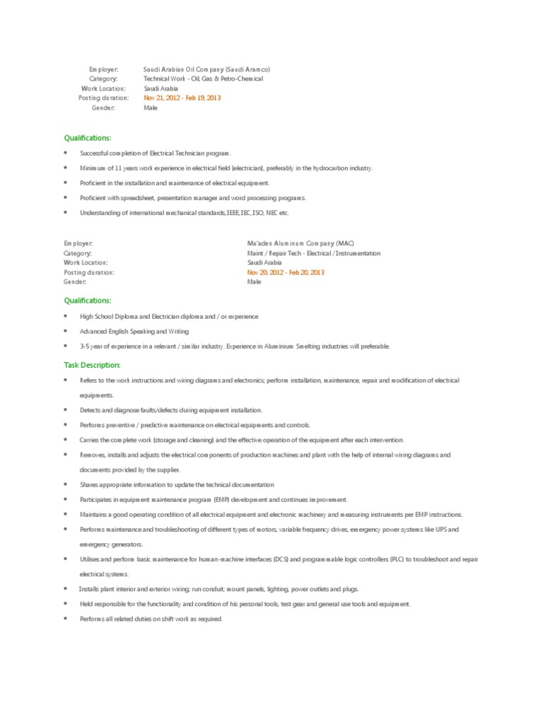 Employer: Category: Work Location: Posting duration: Gender: Please see additional instructions for Saudi Aramco applicants Saudi Arabian Oil Company (Saudi Aramco) Maint / Repair Tech - Electrical / Instrumentation Saudi Arabia Nov 5, 2012 - Feb 13, 2013 Male