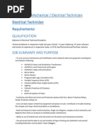 Successful completion of Electrical Technician program. Minimum of 11 years work experience in electrical field (electrician), preferably in the hydrocarbon industry. Proficient in the installation and maintenance of electrical equipment. Proficient with spreadsheet, presentation manager and word processing programs. Understanding of international mechanical standards, IEEE, IEC, ISO, NEC etc.