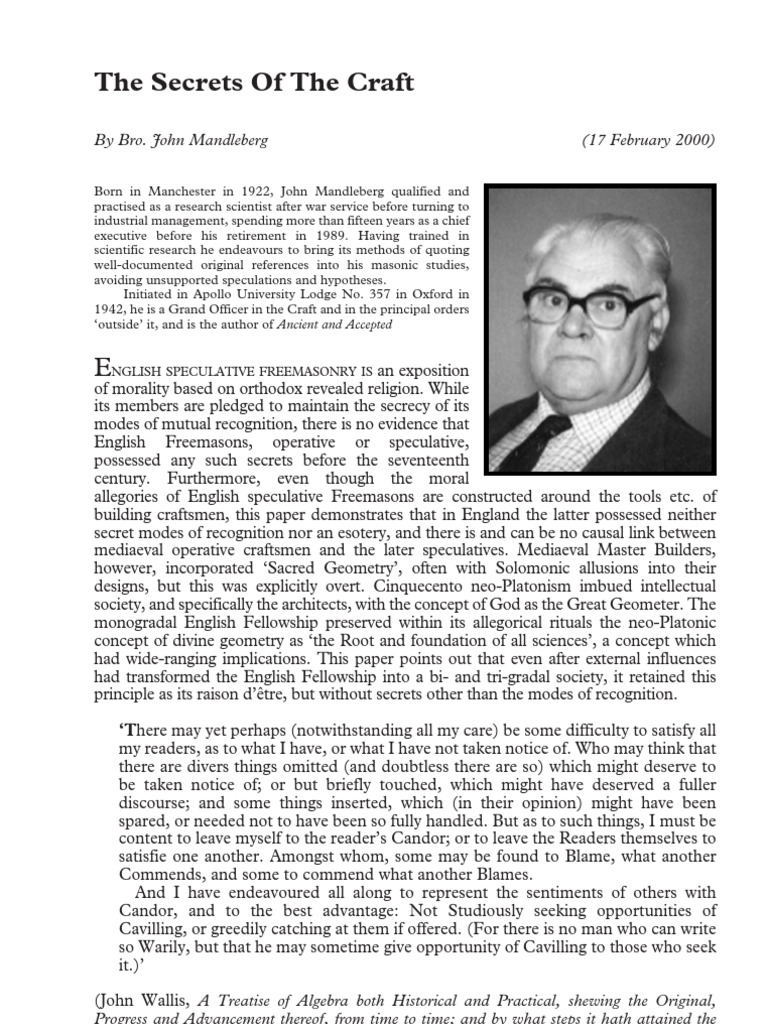 The Brethren who are acquainted with Bro. John Mandlebergs monumental work Ancient and Accepted have no doubt been looking forward to the presentation of this, his paper on the Secrets of the Craft. I congratulate him on having presented the Lodge today with this well researched , methodical and well-argued paper. Rewriting some of the history of the mediaeval building trade, Bro Mandleberg concludes that it is difficult to envisage a close-knit and well-ordered fraternity of a Lodge in anything resembling our sense of the word and that there is no record or other evidence that the masons working tools were moralised by freemasons, operative or speculative, before the eighteenth century. Recognizing the influence of the Sacred Geometry on mediaeval builders and of neo-Platonism on architects of the classical period on the one hand, Bro Mandleberg on the other hand is very convincing in his views that there is nothing secret about these concepts when he argues The object was to expose, and certainly not to conceal the mechanism of the Cosmos which the Great Geometer had created... In my opinion the paragraphs on Sacred Geometry in the middle ages and on the neo-Platonic revival are a valuable contribution to the history of ideas in relation to the subject-matter of this paper. I propose a heartfelt vote of thanks to Bro. John Mandleberg for having presented a thought-provoking and most interesting paper to the Lodge.