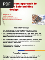 work together. Simply complying with a building code does not necessarily provide optimum fire safety. Evaluating a design for building fire safety represent a systematic approach to a fire safety strategy. To achieve fire safety in a building is through fire prevention, which involves separating potential heat sources from potential fuels. It must be born in the mind that major building fires are started by heat sources and ignitable materials that are stored in the building. Fire prevention is enhanced by careful observance of codes and standards in the design and installation of electrical and lighting system, the heating system and any other built in equipment such as cooking, refrigeration, air conditioning and clothes washing and drying. Venting system is also needed to be designed carefully to carry carbon monoxide and potential fuels along protected paths. Protection from lightning and explosion fires affects the external design of the building. A fire in one building creates an external fire hazard in neighboring structures by exposing those structures to heat by radiation, and possibly by convention currents, as well as to the danger of flying branch of fire. Traditionally the means of escape strategy by and large is based on the principle of single stage evacuation. To achieve this, buildings are designed with stairways of sufficient width to enable all the occupants to evacuate simultaneously. In high rise buildings with large number of occupants it has been found that single phase evacuation is a time consuming process and is impracticable. This has led to a system of evacuation known as phased evacuation in which the building is evacuated in different phases in the event of fire. This method is today recognized as the best method for evacuation in high rise buildings in several countries. Fire fighters as well as disabled people use fire fighting lifts in tall buildings. However, there is a much wider potential use for fire protected lifts in ordinary buildings for general evacuation purpose. This method is particularly useful in super high rise structures where the large vertical travel distances result in a number of significant problems like possible increased exposure to smoke and fire, increased fatigue during evacuation and difficulty in safe evacuation of injured, infants aged or disabled occupants. National Building Code (NBC): The National Building Code of India (NBC) 2005, required compliance with fire safety measures in all residential buildings. The NBC was first published in 1970. The code was revised in 1983 and 2005. The National Building Code of India is a single document in which, like a network, the information contained in various Indian standards is woven into a pattern of continuity and cogency with the inter dependent requirements of sections carefully analyzed and fitted into make the whole document a cogent continuous volume. The Code contains regulations which can be immediately adopted or enacted for use by various departments, municipal administrations and public bodies. It lays down a set of minimum provisions designed to protect the safety of the public with regard to structural sufficiency, fire hazards and health aspects of buildings; so long as these basic requirements are met, the choice of materials and methods of design and construction is left to the ingenuity of the building professionals. The Code also covers aspects such as administrative regulations, development control rules and general building requirements; fire protection requirements; stipulations regarding materials and structural design; rules for design of electrical installations, lighting, air conditioning and lifts; regulations for ventilation, acoustics and plumbing services such as water supply, drainage, sanitation and gas supply; measures to ensure safety of workers and public during construction; and rules for erection of signs and outdoor display structures. The provisions of the code are intended to serve as a model for adoption by Public Works Departments and other government construction departments, local bodies and other