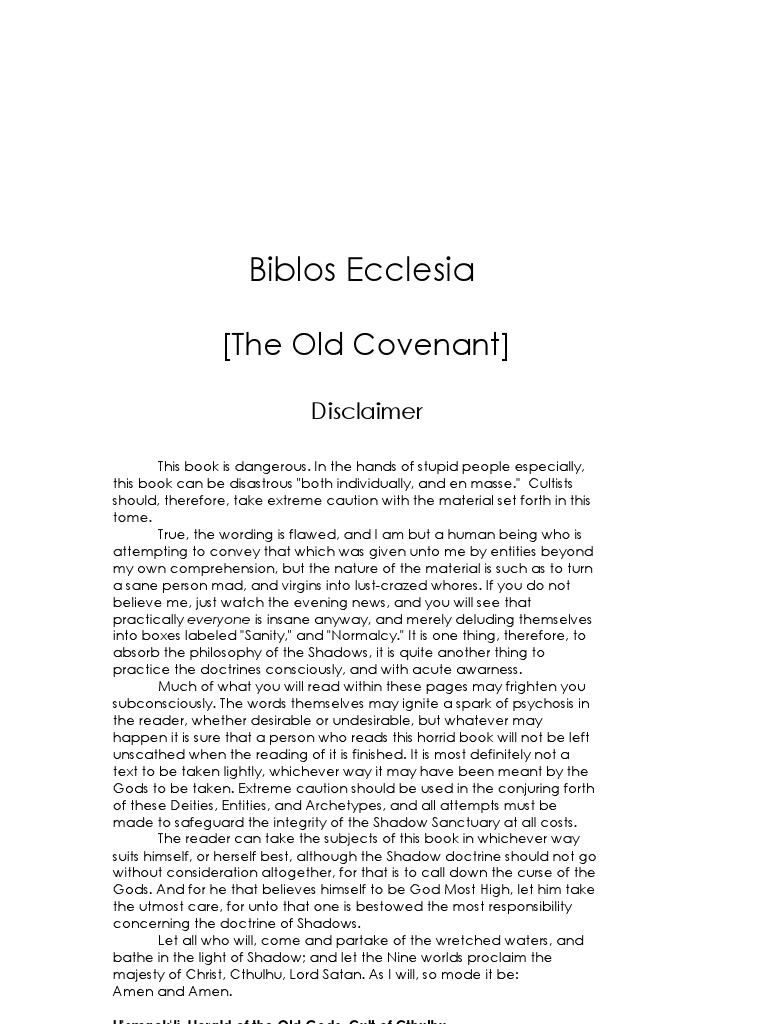purged from among you. 18 Question all things, and when you shall decide upon one thing or another, question even your own actions and intentions, so that all decisions be made in an Awakened state. 19 For Dissolution is imminent, and a destruction which could only be devised by those who have created their Gods, who were first created by them. 20 Indeed, the blood of the Gods does flow through your veins, O child of Yog-Sothoth, and the Spriit of the Gods does rest within you, allwho do belong unto the families and tribes of the Thirteen Royal Bloodlines. 21 Fear not, O Warrior of the Second Dark Age, for when death shall surround you, know that it will not come nigh unto you; 22 For as in the days of old when the covenant was first established, the Lord Ichthys, the Archangel of Death, shall leave the exempt unscathed. 23 But the ones who are on high, yet who are the enemies of righteousness, think themselves to be engaged in doing some great thing by perpetuating false ideals, and by seeking to cultivate ignorance among the masses. 24 And the Lesser Gods shall intensify the suffering of the masses which revere them, hoping to provide their Source with an endless amount of sustenance. 25 Therefore, O Child of God, it is expedient that you devise methods to render yourself indifferent to Suffering, even at the extremity of transmuting pain into pleasure, and reconciling both principles unto one another. 26 And Remember to Remember; to know yourself, and to always seek the knowledge and wisdom which is to be had in Endarkenment. 27 And there shall be no cause to add to any of the words of this book, for the for the words which I do give unto my servant are complete in themselves no matter what they may be; however, should the Gods place a burden upon you to speak either that or this unto the inhabitants of the Earth, then you shall most certainly do it. 28 And you shall fulfill all of the vows which you shall make unto your God, saith the Lord Cthulhu, even Eloah-Mauzzim, the Archangel Ichthys, for the Covenants of the Holy Powers shall not be spoken lightly, but you shall perform your oaths, each and every one. 29 Let these things go forth in secret among you, and let them be graven upon the walls of the city for all to see. 30 Remember also to remain vigilant, looking to the stars from whence comes your redemption; andremember to build R'lyeh amongst yourselves, and in your societies until the Gods shall return to straighten that which has been made crooked, and to make crooked that which has ben made straight. 31 And when death is all you see, remember that God is Death; and when all that you do have is yourself, remember that you are God. 32 Study the whole of this teaching, and speak it unto the people of God in righteousness, whether small or great.