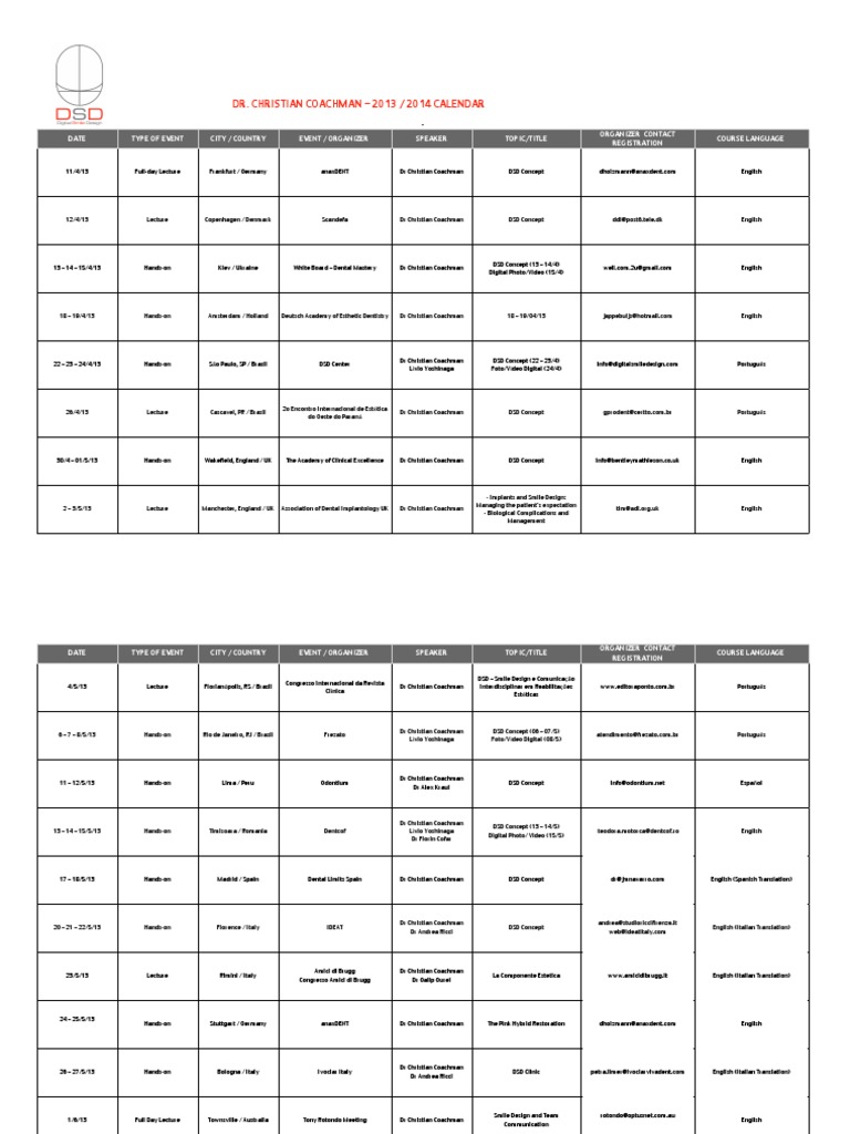 The document provides the calendar of events for Dr. Christian Coachman for 2013-2014, listing over 50 lectures, hands-on courses, and webinars across multiple countries in Europe, South America, North America, Australia, and elsewhere. The events cover topics related to smile design, digital smile design concepts, photography and video techniques, and communication between dentists and technicians. The majority of events are in English or have translation available, with some in Portuguese, Spanish, Italian, Danish, and Russian.