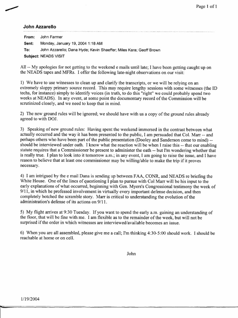 NYC Box 2 Azarello-Brown FAA Docs FDR - Emails - John Farmer - John Azzarello Dana Hyde - Miles Kara Re NEADS Interview and Chat Logs500