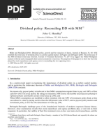 Objection #1: I always thought that MM showed that, although rms must pay out the full present value of free cash ow, the timing of those payouts is irrelevant. Rejoinder: MM allow no variation in the timing of FCF payout. MM mandate payout of all FCF every period, and if the rm wants to pay a yet-higher dividend or buy back more stock today, it sells shares to outsiders and immediately hands over the cash to current stockholders. It is no different than if the current stockholders had sold some (ex-dividend) shares to other investors. The fact that current stockholders get more cash today and less tomorrow is the result of portfolio trades, and has nothing to do with resources received from the rm since the rms retention level never changes. Objection #2: It is unfair to criticize MM (1961) for requiring 100% FCF payout, since that assumption is perfectly appropriate for proving that the choice of how to divide a given cash payout between dividends and repurchases is a matter of indifference in frictionless markets. Rejoinder: Indifference to the dividend/repurchase mix is not sufcient to establish that investment policy is the sole determinant of value, a conclusion that is incorrect once retention is allowed. Moreover, MMs (1961) concern is the level of distributions and not the dividend/repurchase mix, as is evident from the following. (1) MMs opening paragraph asks: Do companies with generous distribution policies consistently sell at a premium over those with niggardly payouts? (2) MM do not mention stock repurchases anywhere in their article, not even in the closing section where they discuss the effect of taxes on payout policy. (3) If MM had repurchases in mind, they would have (should have) stated that the discounted stream of dividends approach understates equity value by the present value of buyback proceeds. (4) The body of MMs irrelevance proof asks: Which is the better strategy for the rm in nancing the investment: to reduce dividends and rely on retained earnings or to raise dividends and oat new shares? (emphasis added). It is not surprising that repurchases are mentioned nowhere in MM (1961) since dividends were the only empirically meaningful equity payout at that time, and so the issue of the dividend/repurchase mix was simply not on the professions radar screen.