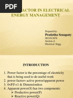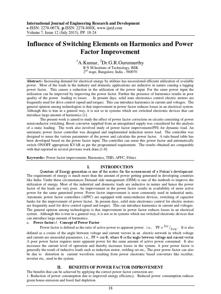 Quantum of Energy generation is one of the metric for the measurement of a Nations development. The requirement of energy is much more than the amount of power getting generated in developing countries like India. Under these circumstances Demand side management (DSM) is one of the methods to improve the utilization of energy. Most of the industrial and domestic loads are inductive in nature and hence the power factor of the loads are very poor. An improvement in the power factor results in availability of more active power for the same generated power. Power factor improvement is most commonly used in industrial units. Automatic power factor controllers (APFC) are equipped with semiconductor devices, switching of capacitor banks for the improvement of power factor. In present days, solid state electronics control for electric motors are frequently used for drive control (speed and torque). This can introduce harmonics in current and voltages. The general opinion among technologists is that improvement in power factor reduces losses in an electrical system. Although this is true in a general way, it is not so in systems which use switched electronic devices that can introduce large amount of harmonics. a. Power factor:1. Concept of Power Factor Power factor is defined as the ratio of active power to apparent power. i.e., PF = . It is also defined as a cosine of the angle between voltage and current vectors in an electric network in which voltage and current are sinusoidal parameters. i.e., PF = cos , where is the angle between voltage and current vector. A poor power factor requires more apparent power for the same amount of active power consumed. It also increases the current level of operation and thereby increases losses in the system. A poor power factor is generally the result of inductive loads such as induction motor, welding set etc,. The poor power factor can also be due to distortion in current waveform resulting from power electronic based converters like rectifier, inverter etc,. used in the system.