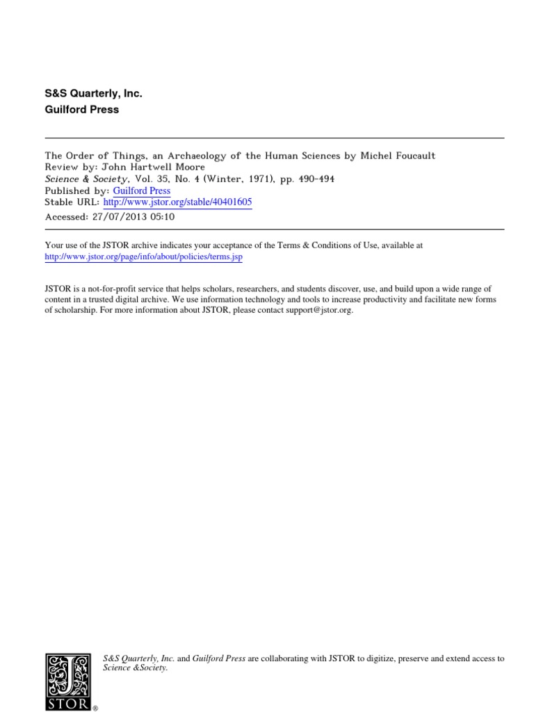 The Order of Things, an Archaeology of the Human Sciences by Michel Foucault Review by: John Hartwell Moore Science & Society, Vol. 35, No. 4 (Winter, 1971), pp. 490-494 Published by: Guilford Press Stable URL: http://www.jstor.org/stable/40401605 . Accessed: 27/07/2013 05:10