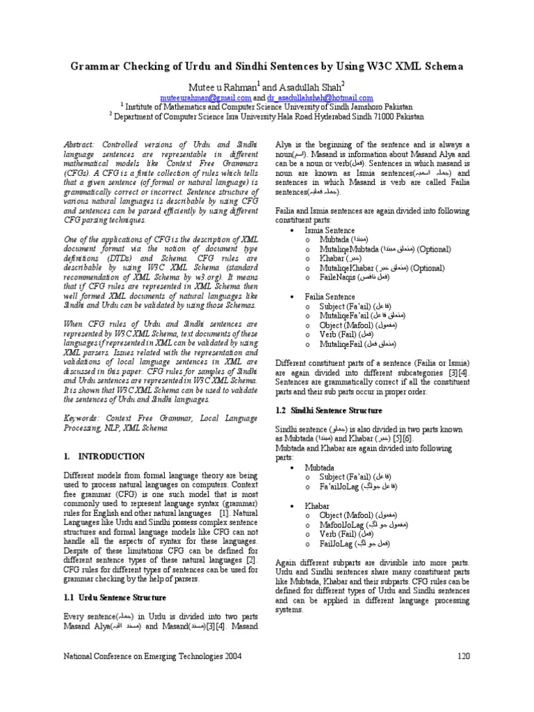 Different models from formal language theory are being used to process natural languages on computers. Context free grammar (CFG) is one such model that is most commonly used to represent language syntax (grammar) rules for English and other natural languages [1]. Natural Languages like Urdu and Sindhi possess complex sentence structures and formal language models like CFG can not handle all the aspects of syntax for these languages. Despite of these limitations CFG can be defined for different sentence types of these natural languages [2]. CFG rules for different types of sentences can be used for grammar checking by the help of parsers. 1.1 Urdu Sentence Structure Every sentence( )in Urdu is divided into two parts Masand Alya( ) and Masand([)3][4]. Masand