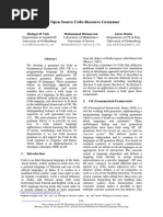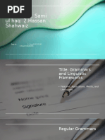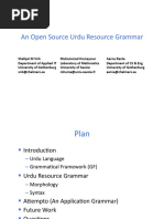 The document discusses representing grammar rules of Urdu and Sindhi sentences using XML Schema. It provides details on: 1) The structure of Urdu and Sindhi sentences, which are divided into different constituent parts like subject, object, verb. 2) Representing sample context-free grammar rules for Urdu and Sindhi sentence types in W3C XML Schema format. 3) How XML Schema definitions can then be used by applications to validate that Urdu and Sindhi sentences are grammatically correct according to the defined rules.