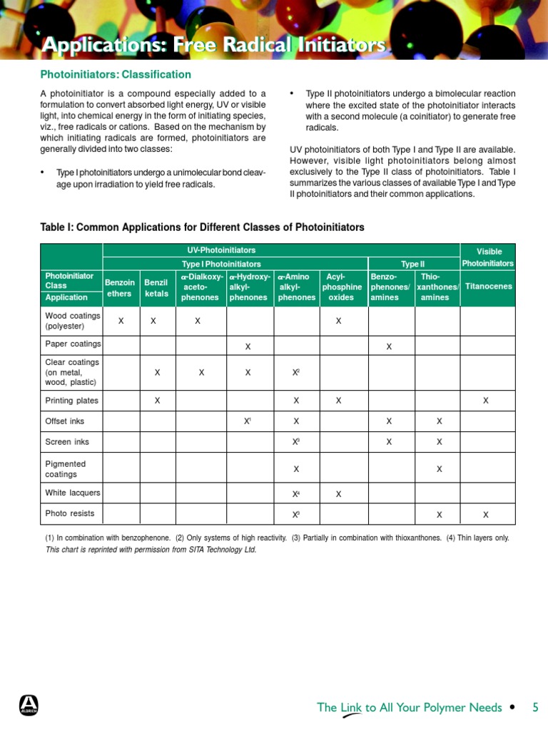 Table I: Common Applications for Different Classes of Photoinitiators