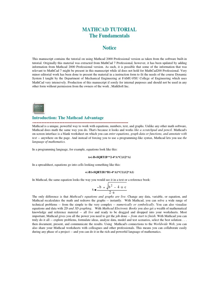 This manuscript contains the tutorial on using Mathcad 2000 Professional version as taken from the software built-in tutorial. Originally this material was extracted from MathCad 7 Professional, however, it has been updated by adding information from Mathcad 2000 Professional version. As such, it is possible that some of the information that was relevant to MathCad 7 might be present in this manuscript while id does not hold for MathCad200 Professional. Very minor editorial work has been done to present the material in a instruction form to fit the needs of the course Dynamic System I taught by the Department of Mechanical Engineering at FAMU-FSU College of Engineering which uses MathCad very intensively. Production of this manuscript if sorely for internal purposes and should not be used in any other form without permission from the owners of the work , MathSoft Inc.