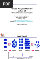 J. Atoms and Molecules/ 3(4); 2013 / 570575 called nematic (N), if it has both orientational and positional order it is called Smectic (Sm).The nematic liquid crystal phase is the most important mesophase. The anisotropy of nematic liquid crystals causes light polarized along the director to propagate at a different velocity than light polarized perpendicular to the director. Nematic liquid crystals are therefore birefrigent. Normally, no light emerges from crossed polarizer i.e. light emerging from first polarizer is completely absorbed by second polarizer. Insertion of isotropic material does not change this behaviour, because polarization of light is unchanged as it travels through isotropic material [112]. The orientational order parameter in thermotropic liquid crystal changes with temperature and this property has been used to investigate the phase transition phenomenon in LC. The different LC phases have distinct texture. Polarizing Microscopy Studies (PMS) is the most preferred technique for phase identification of LC sample. Textures of LC under Polarizing Microscopy are usually taken with the sample between crossed polarizers. The director usually points in different directions at different points within the samples. The areas where the director is oriented parallel or perpendicular to the axes of polarizer appear dark, while areas other than this appear bright. The brightness changes abruptly at many places, indicating that the orientation of the director. These lines are called disclinations and represent places where the director is really undefined, since it points in many directions within an extremely small region. At many places some dark areas convergence at right angles, when director is along one of the polarization axes. The degree of orientational order in a liquid crystal varies with temperature. The refractive index also varies for polarized parallel and perpendicular All rights reserved 2011