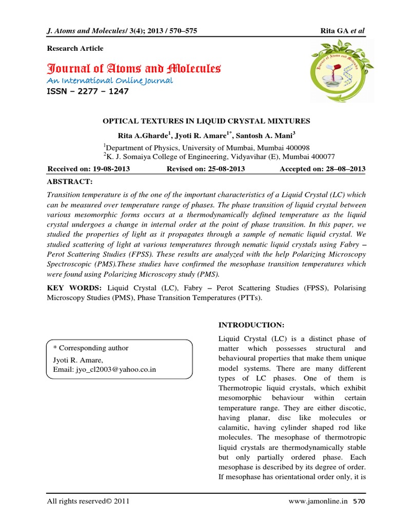 6. Rita Gharde and Sangeeta Thakare Effect of Light on Nematic Liquid Crystal, AIP Conf. Proc. 1391, pp. 86-88; doi:10.1063/1.3646787 www.jamonline.in 574