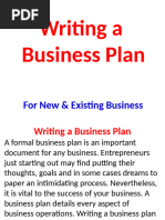 This document provides an outline for a business plan, discussing elements that should be included for both established businesses and startups. It covers sections on the business, market demand, competitors, and preparation. For established businesses, it recommends summarizing the financial history and key developments. For startups, it suggests outlining initial costs and time invested. The market demand section discusses analyzing past and forecasting future growth. Competitors should be analyzed by segment and potential indirect competition. Preparation involves researching market data and organizing the planning team and timeline.