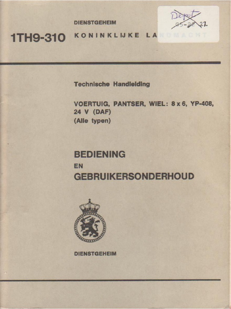 THE OPERATIONAL MANUAL OF THE DUTCH DAF YP-408 ARMOURED CAR FOR THE INFANTERY. THE PREFIX 1 INDICATES THAT IT IS DESTINED FOR THE FIRST ECHELON LIKE THE AMERICAN -10 AND -15.