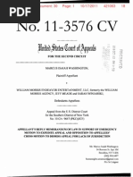 Pending Arbitration on behalf of William Morris. On March 21, 2011,1 raised a unique and narrowed argument in opposition to the arbitration agreement's enforceability: Based on the preexisting historical, statistical and other forms of evidence demonstrating William Morris' 112 year "pattern and practice" of systemic disparate treatment against African Americans and people of color, the "discrimination" and "retaliation" provisions in their arbitration agreement were "unconscionable and [ ] in direct violation of [Section 1981] and [Title V I I ] . " Additional arguments were also raised to support that this landmark civil and human rights case should remain in the federal court and be decided by an impartial jury. In William Mortis' Reply, they argued, "Much like his complaint, Mr. Washington's opposition is filled with outrageous, self-contradictory, and utteriy unsubstantiated allegations about WME and its employees." They also stated that I "raise[d] no credible opposition to the enforcement of his agreement to arbitrate." 18. On July 20, 2011, Judge Castel issued his deceptively written decision staying the case and compelling the case into arbitration. He ignored my entire argument, omitted pertinent facts and misapplied the law in order to conclude that the arbitration agreements should be upheld. Instead of applying antidiscrimination law into the framework of the Federal Arbitration Act, 9 U.S.C. 1 el seq ("FAA") to determine unconscionability, he relied exclusively on the literal language contained within the four corners of the agreement and focused only on the FAA. Castel never decided whether or not the "discrimination" and/or "retaliation" provisions were unconscionable. The 2009 Arbitration Agreement exclusively contained what Castel referred to as the "Delegation Provision." It stated: "The Arbitrator, and not any federal, state, or local court or agency, shall have exclusive authority to resolve any dispute relating to the interpretation, applicability, enforceability or formation of this Agreement, including but not limited to any claim that all or any part of this Agreement is void or voidable." Based on this language. Castle shifted responsibility to the Arbitrator to determine whether the "discrimination" provision was unconscionable and/or whether or not the arbitration agreement should be enforced. There is no indication from Castel's Stay Order that the legislative history of Title V I I , the NYCFIRL or any of the other antidiscrimination statutes mentioned in paragraph 16 were taken into consideration in writing his decision. 19. From September 28, 2011 to June 6, 2011, I made four "good faith" attempts to appeal the erroneous Stay Order of Judge Castel. In my first appeal attempt (hereinafter "Emergency Motion to Appeal"), I demonstrated that Judge Castel's Stay Order was erroneous as a matter of law, adding that the provisions were also tainted with illegality and malum in se. Secondly, 1 demonstrated that there was a "strong public interest" that this case remain in the federal court due to the (1.) the ineffectiveness of the Civil Rights Act of 1964's ability to combat and eradicate insidious and institutional racism throughout the American workplace and to (2.) address the direct role William Morris' (and Hollywood) "cabal-like practices" play in maintaining racism throughout society and the worid due it's considerable influence over powerful communicative mediums such as television and film. Lastly, I used Judge Castel's Stay Order as a lens to support that both he and Magistrate Judge James C. Francis should be disqualified from my case due to what I believed was an "appearance and/or actual bias, prejudice and/or impropriety" pursuant to 28 U.S.C. 455 and 28 U.S.C. 2106. William Morris never rebutted my arguments that Judge Castel applied the wrong standard of law in their Opposition filed on October 7, 2011. Instead, they argued that the Court did not have jurisdiction to hear the appeal because Judge Castel issued an interlocutory order and that my appeal was "moot." In my Reply submitted on October 17, 2011, I responded by stating that Michael P. Zweig and Loeb & Loeb LLP's "counter arguments [were] moot, substantively insufficient and serve[d] as nothing more than a smoke-screen to deceive the Court into believing that their words are of meaning." I also showed that the request for an expedited appeal was justified and not "moot" by demonstrating an "extraordinary showing o f 'good cause'" pursuant to section 1292(b), as codified 28 U.S.C. 1292(b). On December 13, 2013, the three panel judges - Denny Chin, Peter W. Hall and Gerard E. Lynch - mirrored the arguments of William Morris and Loeb & Loeb LLP with a one paragraph, stating that the appellate court did not have jurisdiction to hear an interlocutory appeal and dismissed my appeal as being "moot."