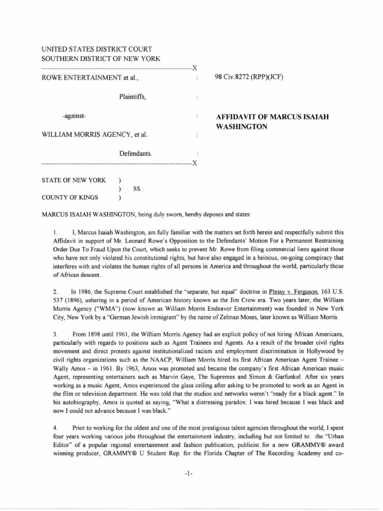 MARCUS ISAIAH WASHINGTON, being duly sworn, hereby deposes and states: 1. I , Marcus Isaiah Washington, am fully familiar with the matters set forth herein and respectfully submit this Affidavit in support of Mr. Leonard Rowe's Opposition to the Defendants' Motion For a Permanent Restraining Order Due To Fraud Upon the Court, which seeks to prevent Mr. Rowe from filing commercial liens against those who have not only violated his constitutional rights, but have also engaged in a heinous, on-going conspiracy that interferes with and violates the human rights of all persons in America and throughout the world, particularly those of African descent. 2. In 1986, the Supreme Court established the "separate, but equal" doctrine in Plessy v. Ferguson. 163 U.S. 537 (1896), ushering in a period of American history known as the Jim Crow era. Two years later, the William Morris Agency ("WMA") (now known as William Morris Endeavor Entertainment) was founded in New York City, New York by a "German Jewish immigrant" by the name of Zelman Moses, later known as William Morris. 3. From 1898 until 1961, the William Morris Agency had an explicit policy of not hiring African Americans, particularly with regards to positions such as Agent Trainees and Agents. As a result of the broader civil rights movement and direct protests against institutionalized racism and employment discrimination in Hollywood by civil rights organizations such as the NAACP, William Morris hired its first African American Agent Trainee Wally Amos - in 1961. By 1963, Amos was promoted and became the company's first African American music Agent, representing entertainers such as Marvin Gaye, The Supremes and Simon & Garflmkel. After six years working as a music Agent, Amos experienced the glass ceiling after asking to be promoted to work as an Agent in the film or television department. He was told that the studios and networks weren't "ready for a black agent." In his autobiography, Amos is quoted as saying, "What a distressing paradox: I was hired because I was black and now I could not advance because 1 was black." 4. Prior to working for the oldest and one of the most prestigious talent agencies throughout the world, I spent four years working various jobs throughout the entertainment industry, including but not limited to: the "Urban Editor" of a popular regional entertainment and fashion publication, publicist for a now GRAMMY award winning producer, GRAMMY U Student Rep. for the Florida Chapter of The Recording Academy and co-