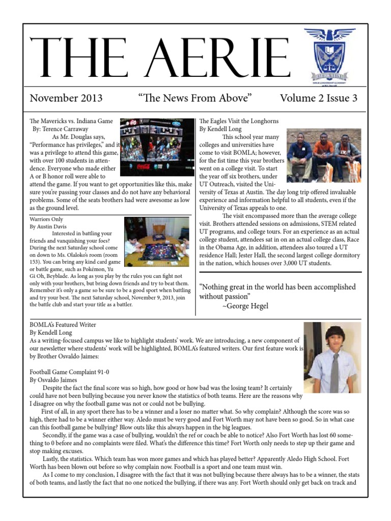 BOMLAs Featured Writer By Kendell Long As a writing-focused campus we like to highlight students work. We are introducing, a new component of our newsletter where students work will be highlighted, BOMLAs featured writers. Our first feature work is by Brother Osvaldo Jaimes: Football Game Complaint 91-0 By Osvaldo Jaimes Despite the fact the final score was so high, how good or how bad was the losing team? It certainly could have not been bullying because you never know the statistics of both teams. Here are the reasons why I disagree on why the football game was not or could not be bullying. First of all, in any sport there has to be a winner and a loser no matter what. So why complain? Although the score was so high, there had to be a winner either way. Aledo must be very good and Fort Worth may not have been so good. So in what case can this football game be bullying? Blow outs like this always happen in the big leagues. Secondly, if the game was a case of bullying, wouldnt the ref or coach be able to notice? Also Fort Worth has lost 60 something to 0 before and no complaints were filed. Whats the difference this time? Fort Worth only needs to step up their game and stop making excuses. Lastly, the statistics. Which team has won more games and which has played better? Apparently Aledo High School. Fort Worth has been blown out before so why complain now. Football is a sport and one team must win. As I come to my conclusion, I disagree with the fact that it was not bullying because there always has to be a winner, the stats of both teams, and lastly the fact that no one noticed the bullying, if there was any. Fort Worth should only get back on track and