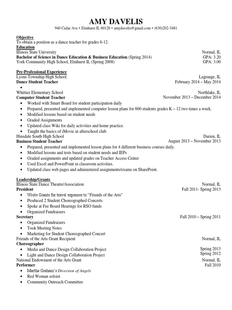 Objective To obtain a position as a dance teacher for grades 6-12. Education Illinois State University Bachelor of Science in Dance Education & Business Education (Spring 2014) York Community High School, Elmhurst IL (Spring 2008) Pre-Professional Experience Lyons Township High School Dance Student Teacher