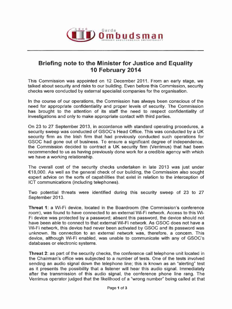 This Commission was appointed on 12 December 2011. From an early stage, we talked about security and risks to our building. Even before this Commission, security checks were conducted by external specialist companies for the organisation. In the course of our operations, the Commission has always been conscious of the need for appropriate confidentiality and proper levels of security. The Commission has brought to the attention of its staff the need to respect confidentiality of investigations and only to make appropriate contact with third parties. On 23 to 27 September 2013, in accordance with standard operating procedures, a security sweep was conducted of GSOC's Head Office. This was conducted by a UK security firm as the Irish firm that had previously conducted such operations for GSOC had gone out of business. To ensure a significant degree of independence, the Commission decided to contract a UK security firm (Verrimus) that had been recommended to us as having previously done work for a credible agency with which we have a working relationship. The overall cost of the security checks undertaken in late 2013 was just under 18,000. As well as the general check of our building, the Commission also sought expert advice on the sorts of capabilities that exist in relation to the interception of ICT communications (including telephones). Two potential threats were identified during this security sweep of 23 to 27 September 2013. Threat 1: a Wi-Fi device, located in the Boardroom (the Commission's conference room), was found to have connected to an external Wi-Fi network. Access to this WiFi device was protected by a password; absent this password, the device should not have been able to connect to that external Wi-Fi network. As GSOC does not have a Wi-Fi network, this device had never been activated by GSOC and its password was unknown. Its connection to an external network was, therefore, a concern. This device, although Wi-Fi enabled, was unable to communicate with any of GSOC's databases or electronic systems. Threat 2: as part of the security checks, the conference call telephone unit located in the Chairman's office was subjected to a number of tests. One of the tests involved sending an audio signal down the telephone line; this is known as an "alerting" test as it presents the possibility that a listener will hear this audio signal. Immediately after the transmission of this audio signal, the conference phone line rang. The Verrimus operator judged that the likelihood of a "wrong number" being called at that
