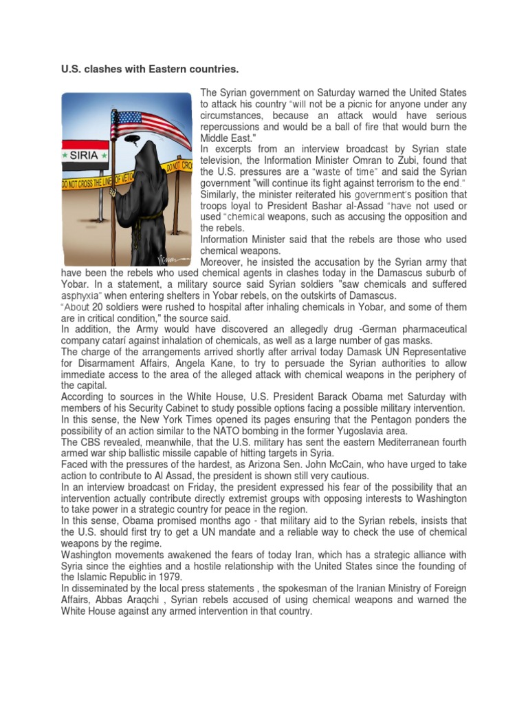 Estados Unidos en enfrentamientos con pases del Oriente. El Gobierno sirio advirti este sbado a Estados Unidos de que atacar su pas "no ser un picnic para nadie bajo ninguna circunstancia, porque una agresin tendra graves repercusiones y sera una bola de fuego que hara arder todo Oriente Medio". En extractos de una entrevista difundidos por la televisin estatal siria, el ministro de Informacin, Omran al Zubi, consider que las presiones de Estados Unidos son una "prdida de tiempo", y seal que el Gobierno sirio "continuar su combate contra el terrorismo hasta el final". De igual forma, el ministro reiter la posicin de su gobierno de que las tropas leales al presidente Bachar al Asad "no han usado ni usarn" armamento qumico, como los acusa la oposicin y los rebeldes. El ministro de Informacin dice que son los rebeldes los que usaron armas qumicas. Adems, insisti en la acusacin formulada por el Ejrcito sirio de que han sido los rebeldes quienes utilizaron agentes qumicos en los enfrentamientos hoy en el suburbio damasceno de Yobar. En un comunicado, una fuente militar asegur que uniformados sirios "vieron elementos qumicos y sufrieron asfixia" cuando entraban en refugios de los rebeldes en Yobar, en la periferia de Damasco. "Unos 20 soldados fueron trasladados de urgencia al hospital tras haber inhalado agentes qumicos en Yobar, y algunos de ellos se encuentran en estado crtico", seal la fuente. Adems, el Ejrcito habra descubierto supuestamente medicinas de una compaa farmacutica germano-catar contra la inhalacin de agentes qumicos, as como un gran nmero de mscaras antigs. La acusacin del rgimen lleg poco despus de la llegada hoy a Damasco de la representante de la ONU para Asuntos de Desarme, Angela Kane, para intentar persuadir a las autoridades sirias de que permitan el acceso inmediato a la zona del supuesto ataque con armas qumicas en la periferia de la capital. Segn fuentes de la Casa Blanca, el presidente estadounidense, Barack Obama, se reuni este sbado con miembros de sus gabinete de Seguridad para estudiar posibles opciones de cara a una eventual intervencin blica. En este sentido, el diario The New York Times abri sus pginas asegurando que el Pentgono sopesa la posibilidad de una accin rea similar a los bombardeos de la OTAN en la antigua Yugoslavia. La cadena de televisin CBS revel, por su parte, que el Ejrcito estadounidense ha enviado al Mediterrneo oriental un cuarto buque de guerra armado con misiles balsticos capaces de alcanzar objetivos en Siria. Frente a las presiones de los ms duros, como el senador republicano de Arizona, John McCain, que han urgido a emprender alguna accin que contribuya al fin de Al Asad, el mandatario se muestra an muy cauto. En una entrevista difundida el viernes, el presidente manifest su temor a la posibilidad de que una intervencin directacontribuya en realidad a que grupos extremistas con