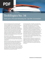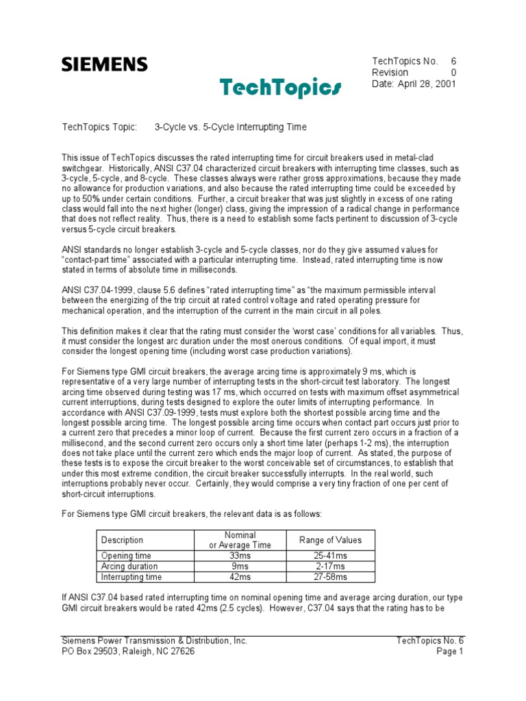 This issue of TechTopics discusses the rated interrupting time for circuit breakers used in metal-clad switchgear. Historically, ANSI C37.04 characterized circuit breakers with interrupting time classes, such as 3-cycle, 5-cycle, and 8-cycle. These classes always were rather gross approximations, because they made no allowance for production variations, and also because the rated interrupting time could be exceeded by up to 50% under certain conditions. Further, a circuit breaker that was just slightly in excess of one rating class would fall into the next higher (longer) class, giving the impression of a radical change in performance that does not reflect reality. Thus, there is a need to establish some facts pertinent to discussion of 3-cycle versus 5-cycle circuit breakers. ANSI standards no longer establish 3-cycle and 5-cycle classes, nor do they give assumed values for contact-part time associated with a particular interrupting time. Instead, rated interrupting time is now stated in terms of absolute time in milliseconds. ANSI C37.04-1999, clause 5.6 defines rated interrupting time as the maximum permissible interval between the energizing of the trip circuit at rated control voltage and rated operating pressure for mechanical operation, and the interruption of the current in the main circuit in all poles. This definition makes it clear that the rating must consider the worst case conditions for all variables. Thus, it must consider the longest arc duration under the most onerous conditions. Of equal import, it must consider the longest opening time (including worst case production variations). For Siemens type GMI circuit breakers, the average arcing time is approximately 9 ms, which is representative of a very large number of interrupting tests in the short-circuit test laboratory. The longest arcing time observed during testing was 17 ms, which occurred on tests with maximum offset asymmetrical current interruptions, during tests designed to explore the outer limits of interrupting performance. In accordance with ANSI C37.09-1999, tests must explore both the shortest possible arcing time and the longest possible arcing time. The longest possible arcing time occurs when contact part occurs just prior to a current zero that precedes a minor loop of current. Because the first current zero occurs in a fraction of a millisecond, and the second current zero occurs only a short time later (perhaps 1-2 ms), the interruption does not take place until the current zero which ends the major loop of current. As stated, the purpose of these tests is to expose the circuit breaker to the worst conceivable set of circumstances, to establish that under this most extreme condition, the circuit breaker successfully interrupts. In the real world, such interruptions probably never occur. Certainly, they would comprise a very tiny fraction of one per cent of short-circuit interruptions. For Siemens type GMI circuit breakers, the relevant data is as follows: Description Opening time Arcing duration Interrupting time Nominal or Average Time 33ms 9ms 42ms Range of Values 25-41ms 2-17ms 27-58ms