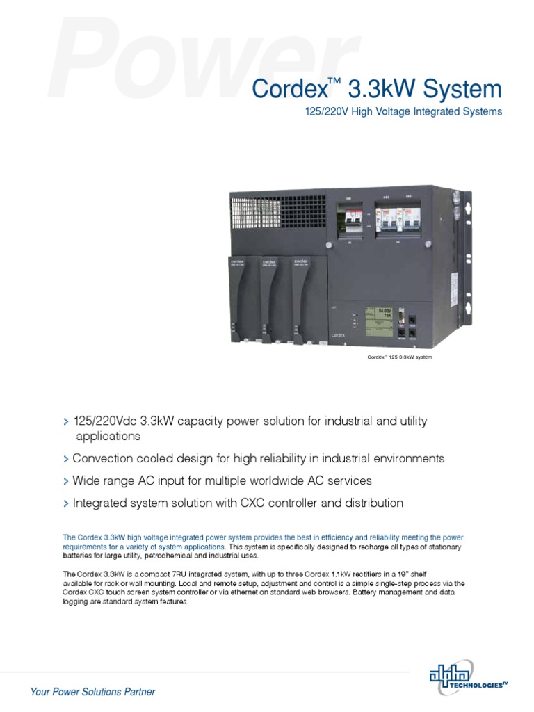 The Cordex 3.3kW high voltage integrated power system provides the best in efciency and reliability meeting the power requirements for a variety of system applications. This system is specifically designed to recharge all types of stationary batteries for large utility, petrochemical and industrial uses. The Cordex 3.3kW is a compact 7RU integrated system, with up to three Cordex 1.1kW rectifiers in a 19 shelf available for rack or wall mounting. Local and remote setup, adjustment and control is a simple single-step process via the Cordex CXC touch screen system controller or via ethernet on standard web browsers. Battery management and data logging are standard system features.