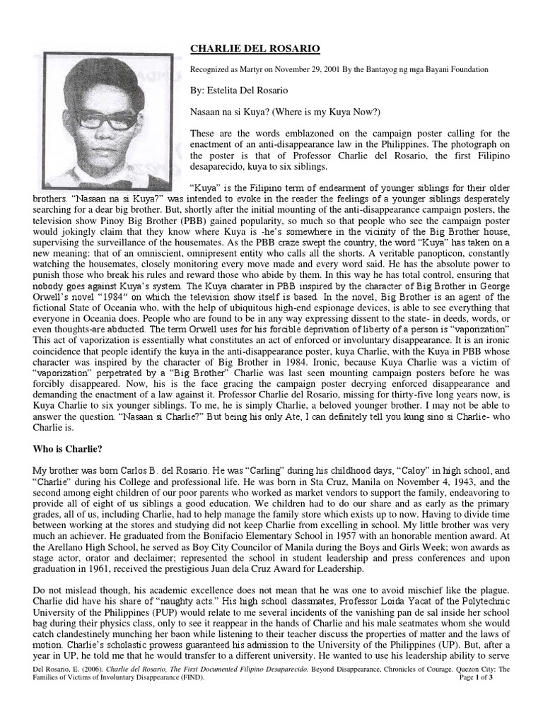 By: Estelita Del Rosario Nasaan na si Kuya? (Where is my Kuya Now?) These are the words emblazoned on the campaign poster calling for the enactment of an anti-disappearance law in the Philippines. The photograph on the poster is that of Professor Charlie del Rosario, the first Filipino desaparecido, kuya to six siblings. Kuya is the Filipino term of endearment of younger siblings for their older brothers. Nasaan na si Kuya? was intended to evoke in the reader the feelings of a younger siblings desperately searching for a dear big brother. But, shortly after the initial mounting of the anti-disappearance campaign posters, the television show Pinoy Big Brother (PBB) gained popularity, so much so that people who see the campaign poster would jokingly claim that they know where Kuya is -hes somewhere in the vicinity of the Big Brother house, supervising the surveillance of the housemates. As the PBB craze swept the country, the word Kuya has taken on a new meaning: that of an omniscient, omnipresent entity who calls all the shorts. A veritable panopticon, constantly watching the housemates, closely monitoring every move made and every word said. He has the absolute power to punish those who break his rules and reward those who abide by them. In this way he has total control, ensuring that nobody goes against Kuyas system. The Kuya charater in PBB inspired by the character of Big Brother in George Orwells novel 1984 on which the television show itself is based. In the novel, Big Brother is an agent of the fictional State of Oceania who, with the help of ubiquitous high-end espionage devices, is able to see everything that everyone in Oceania does. People who are found to be in any way expressing dissent to the state- in deeds, words, or even thoughts-are abducted. The term Orwell uses for his forcible deprivation of liberty of a person is vaporization This act of vaporization is essentially what constitutes an act of enforced or involuntary disappearance. It is an ironic coincidence that people identify the kuya in the anti-disappearance poster, kuya Charlie, with the Kuya in PBB whose character was inspired by the character of Big Brother in 1984. Ironic, because Kuya Charlie was a victim of vaporization perpetrated by a Big Brother Charlie was last seen mounting campaign posters before he was forcibly disappeared. Now, his is the face gracing the campaign poster decrying enforced disappearance and demanding the enactment of a law against it. Professor Charlie del Rosario, missing for thirty-five long years now, is Kuya Charlie to six younger siblings. To me, he is simply Charlie, a beloved younger brother. I may not be able to answer the question. Nasaan si Charlie? But being his only Ate, I can definitely tell you kung sino si Charlie - who Charlie is. Who is Charlie? My brother was born Carlos B. del Rosario. He was Carling during his childhood days, Caloy in high school, and Charlie during his College and professional life. He was born in Sta Cruz, Manila on November 4, 1943, and the second among eight children of our poor parents who worked as market vendors to support the family, endeavoring to provide all of eight of us siblings a good education. We children had to do our share and as early as the primary grades, all of us, including Charlie, had to help manage the family store which exists up to now. Having to divide time between working at the stores and studying did not keep Charlie from excelling in school. My little brother was very much an achiever. He graduated from the Bonifacio Elementary School in 1957 with an honorable mention award. At the Arellano High School, he served as Boy City Councilor of Manila during the Boys and Girls Week; won awards as stage actor, orator and declaimer; represented the school in student leadership and press conferences and upon graduation in 1961, received the prestigious Juan dela Cruz Award for Leadership. Do not mislead though, his academic excellence does not mean that he was one to avoid mischief like the plague. Charlie did have his share of naughty acts. His high school classmates, Professor Loida Yacat of the Polytechnic University of the Philippines (PUP) would relate to me several incidents of the vanishing pan de sal inside her school bag during their physics class, only to see it reappear in the hands of Charlie and his male seatmates whom she would catch clandestinely munching her baon while listening to their teacher discuss the properties of matter and the laws of motion. Charlies scholastic prowess guaranteed his admission to the University of the Philippines (UP). But, after a year in UP, he told me that he would transfer to a different university. He wanted to use his leadership ability to serve