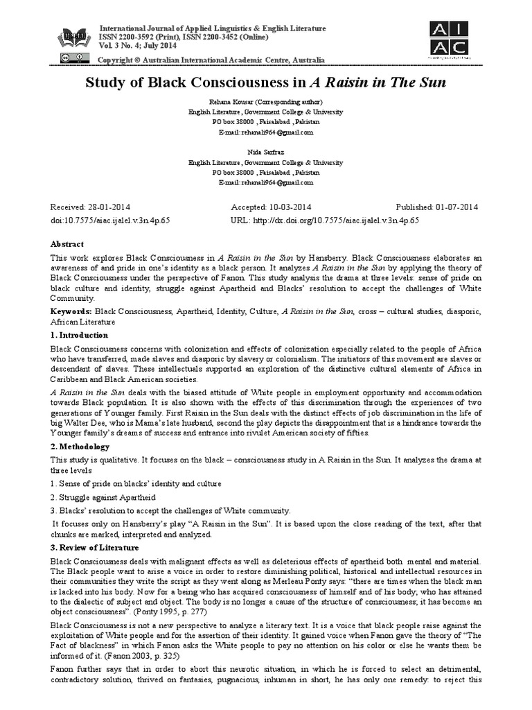 This work explores Black Consciousness in A Raisin in the Sun by Hansberry. Black Consciousness elaborates an
