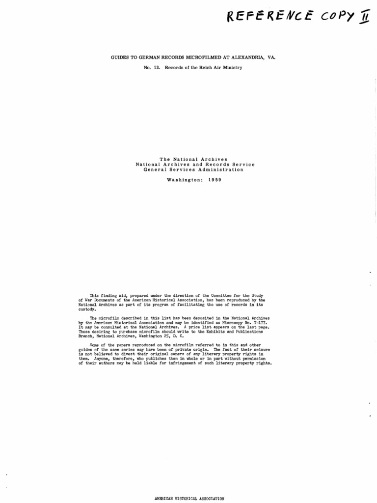 The present Guide covers 52 rolls of film of records of the Reichsluftfahrtministerium (national Archives World War II Records Division, Record