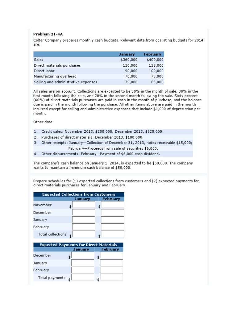 This document provides operating budget data for Colter Company for January and February 2014, including sales, expenses, and other financial information. It asks to prepare schedules for expected customer collections and direct materials purchases for those months based on the payment terms. It then asks to prepare a two-month cash budget in columnar format using the provided data.