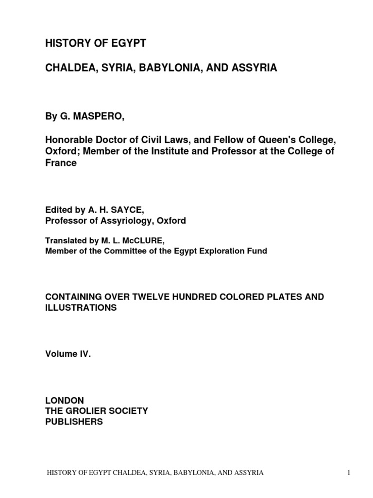 HISTORY of Egypt CHALDEA, SYRIA, BABYLONIA, AND ASSYRIA By G. MASPERO, Honorable doctor of civil laws, and fellow of queen's college, Oxford. Volume IV CONTAINING OVER TWELVE HUNDRED COLORED PLATES and ILLUSTRATIONS.