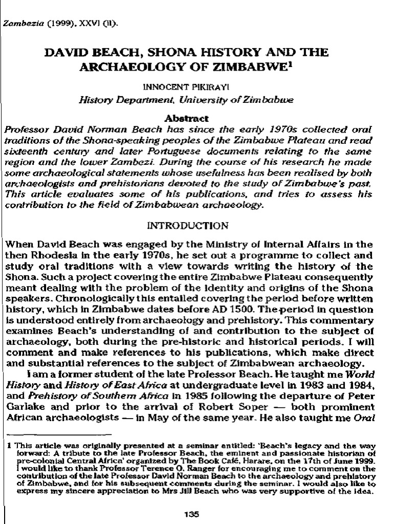 136 DAVID BEACH, SHONA HISTORY AND THE ARCHAEOLOGY OF ZIMBABWE