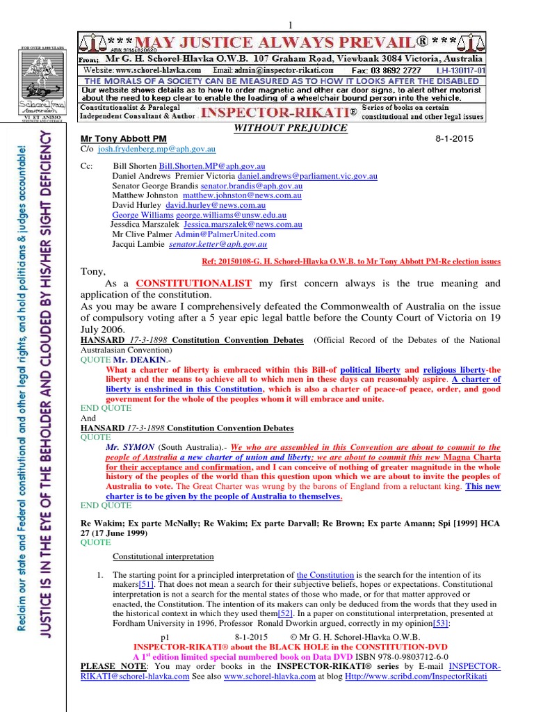 G. H. Schorel-Hlavka O.W.B. To MR TONY ABBOTT PM-Re Election Issues