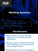 The document discusses welding symbols and their components. It provides details on: - The main components of a welding symbol including the reference line, arrow, and instructions. - How welding symbols distinguish the two sides of a joint and indicate whether a weld is made in the field or shop. - The main types of welds - fillet, groove, plug, and slot - and their associated symbols. Descriptions of each weld type include cross-sections, dimensions, and supplementary details. - Additional symbols used with groove welds for features like melt-through and backing bars.